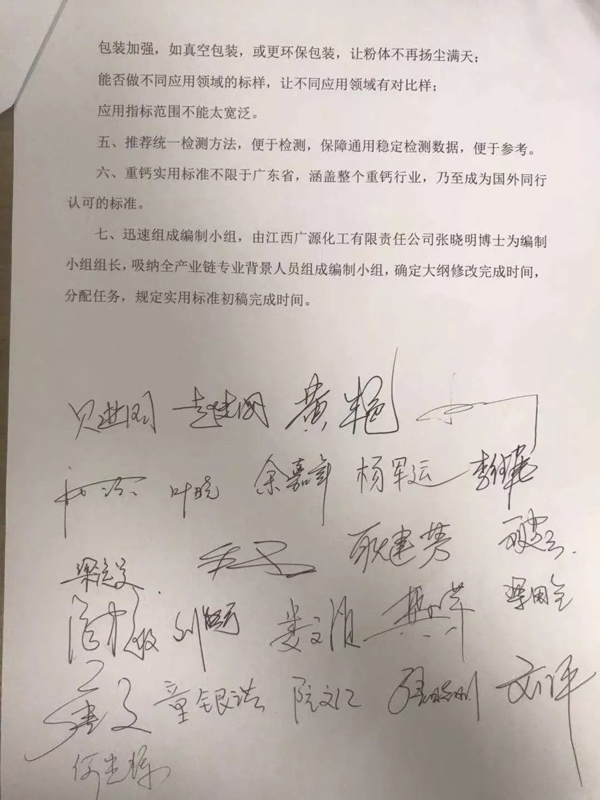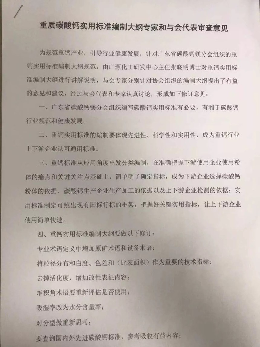 專家及企業家合照 附:重質碳酸鈣實用標準編制大綱專家和與會代表審查意見 為規范重鈣產業,引導行業健康發展,針對廣東省碳酸鈣鎂分會組織的重鈣實用標準編制大綱規范,由廣源化工研發中心主任張曉明博士對重鈣實用標準編制大綱進行講解說明,與會專家分別針對協會組織的編制大綱提出了有益的意見和建議,經過與會代表和專家認真討論,形成如下修訂意見: 一、廣東省碳酸鈣鎂分會組織編寫碳酸鈣實用標準有必要,有利于碳酸鈣行業規范和健康發展。 二、重鈣實用標準的編制要體現先進性、科學性和實用性,成為重鈣行業上下游企業認可通用標準。 三、重鈣標準從應用角度出發分類編制,在準確把握下游使用企業使用粉體的痛點和關鍵關注點基礎上,簡單明了確定指標,成為下游企業選擇碳酸鈣粉體的依據、碳酸鈣生產企業生產加工的依據以及上下游企業檢測的依據;實用標準制定可跳出現有國標行標的框架,把握好關鍵實用指標,讓上下游企業使用簡單快速。 四、重鈣實用標準編制大綱要做以下修訂: 專業術語定義中增加原礦術語和設備術語; 將粒徑分布和白度、色差和(比表面積)作為重要的技術指標; 去掉活化度,增加改性表征內容; 堆積角術語要重新評估是否使用; 吸濕率改為水分含量率; 對分型做重新思考; 要查詢國內外先進碳酸鈣標準,參考吸收有益內容; 包裝加強,如真空包裝,或更環保包裝,讓粉體不再揚塵滿天; 能否做不同應用領域的標樣,讓不同應用領域有對比樣; 應用指標范圍不能太寬泛。 五、推薦統一檢測方法,便于檢測,保障通用穩定檢測數據,便于參考。 六、重鈣實用標準不限于廣東省,涵蓋整個重鈣行業,乃至成為國外同行認可的標準。 七、迅速組成編制小組,由江西廣源化工有限責任公司張曉明博士為編制小組組長,吸納全產業鏈專業背景人員組成編制小組,確定大綱修改完成時間,分配任務,規定實用標準初稿完成時間。