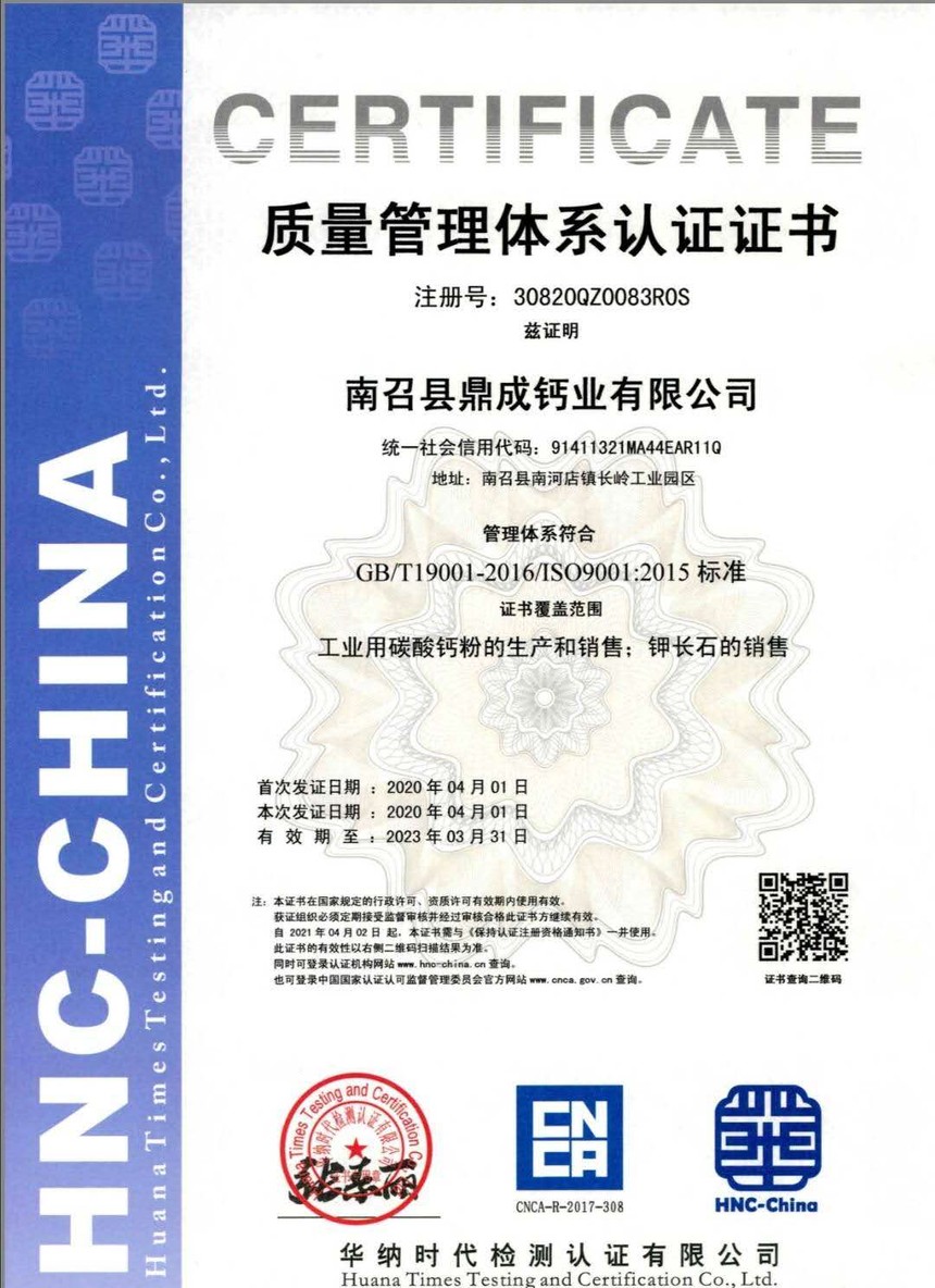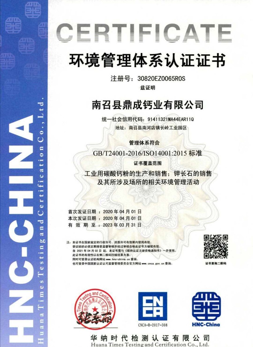 熱烈祝賀我公司榮獲質量管理體系和環境管理體系認證證書时间:2020-04-06 作者:鼎成鈣業【原创】 2020年4月,我司接到質量認證機構頒發的質量管理體系認證證書和環境管理體系認證證書,標志著我司順利通過GB/T19001-2016/ISO9001:2015質量管理體系認證、GB/T24001-2016/ISO14001:2015環境管理體系認證工作。